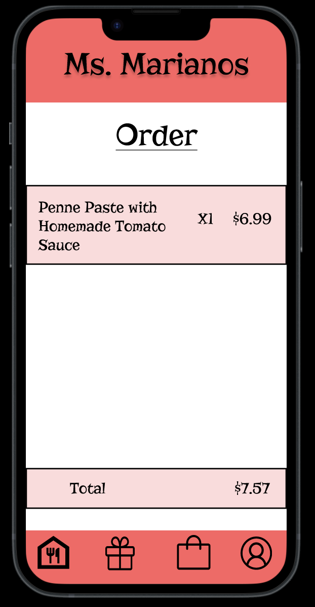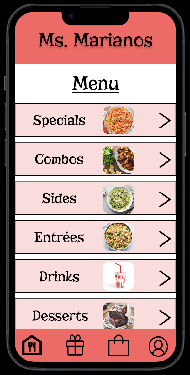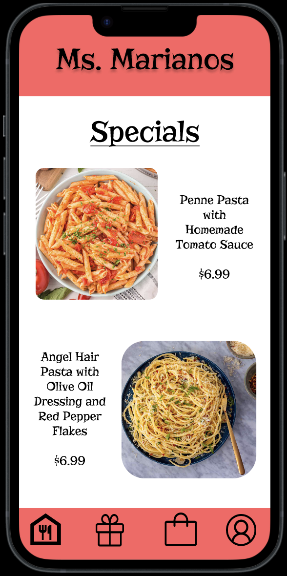 Here you can see our daily coupons, holiday specials, new menu items, ect. From this page you can add items to your cart or navigate your way to the whole menu by pressing the utensils in the bottom left corner. You can see your rewards by pressing the gift button or see your account by pressing the button in the bottom right. If you are ready to check out then you can press the bag button.